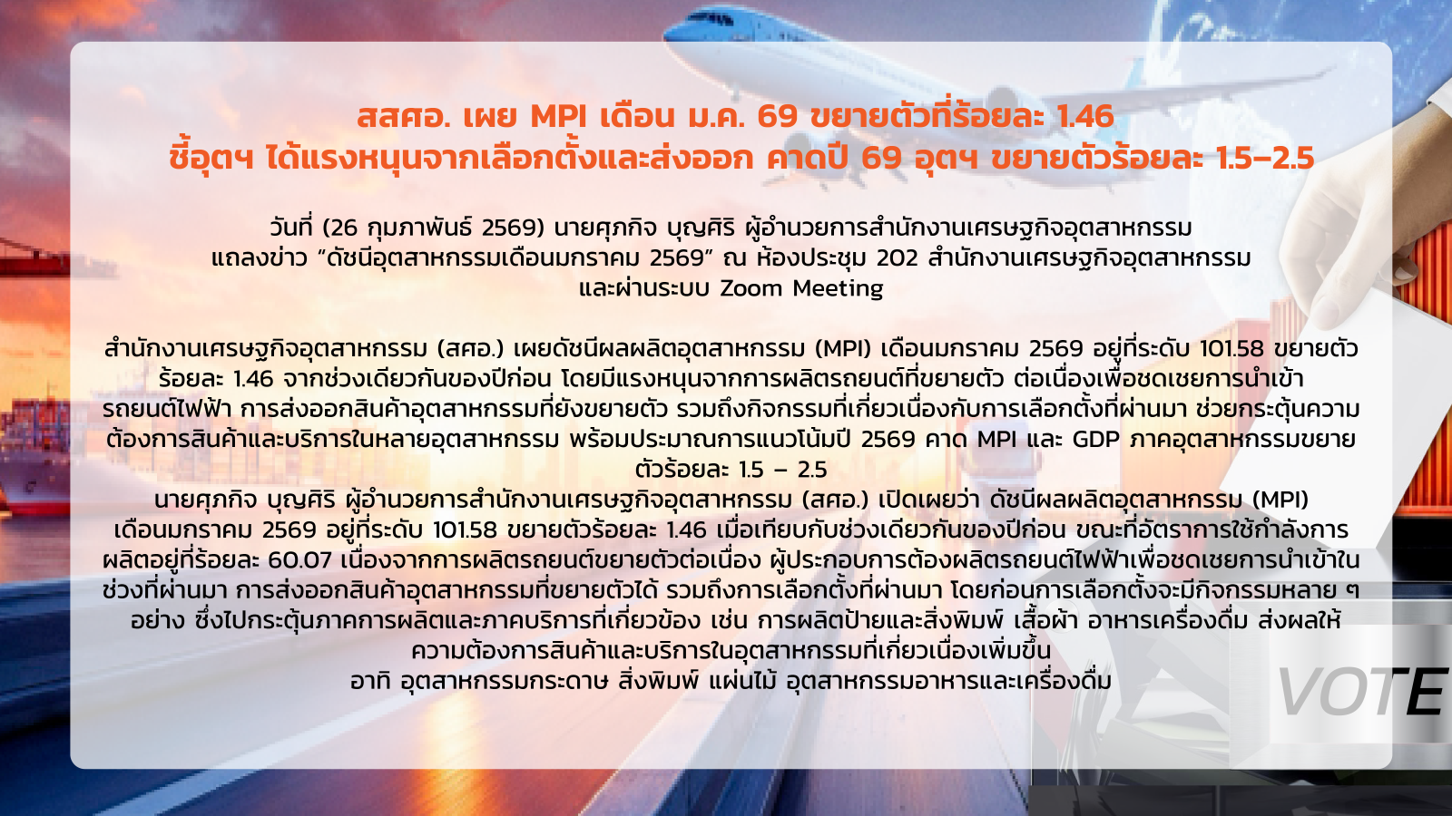 ภาพรวมดัชนีอุตสาหกรรม เดือนตุลาคม 2568 11/29/2025 10:57:58 AM ดาวน์โหลดเอกสาร 3234 ดาวน์โหลดเอกสารอื่นๆที่เกี่ยวข้อง